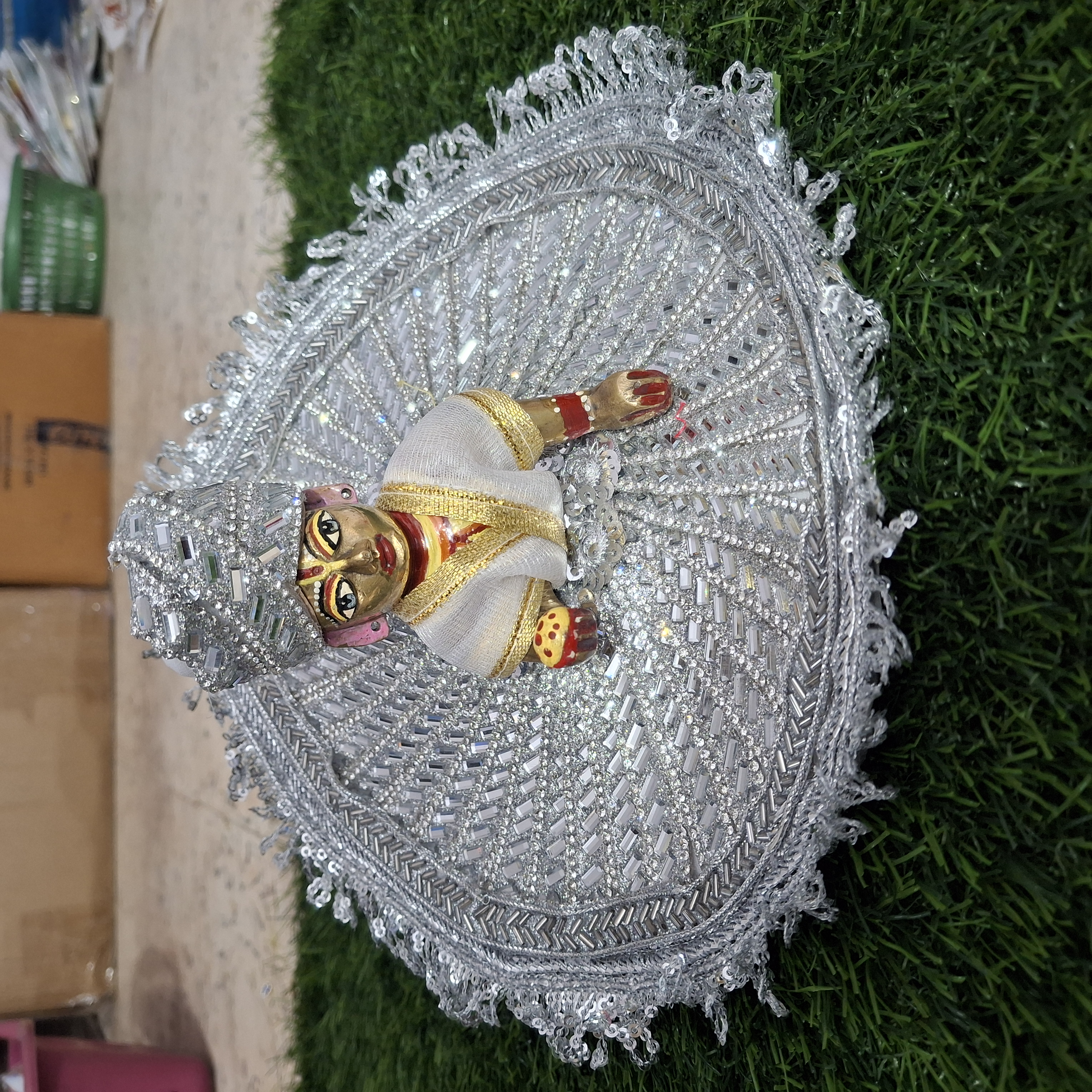 Adorn your beloved Laddu Gopal with this majestic Chandra-Neel (Moon-Blue) Pearl-Kundan Vastara Set. This outfit is a blend of two glorious colors: a pure white/silver base accented with attractive blue floral elements. The entire dress is lavishly decorated with shimmering Silver and White Pearls, brilliant Kundan stones, and sparkling Diamond Work. The beauty is enhanced by a circumference of blue flowers and a net of silver pearls, lending it a cool, peaceful, and extremely grand appearance.