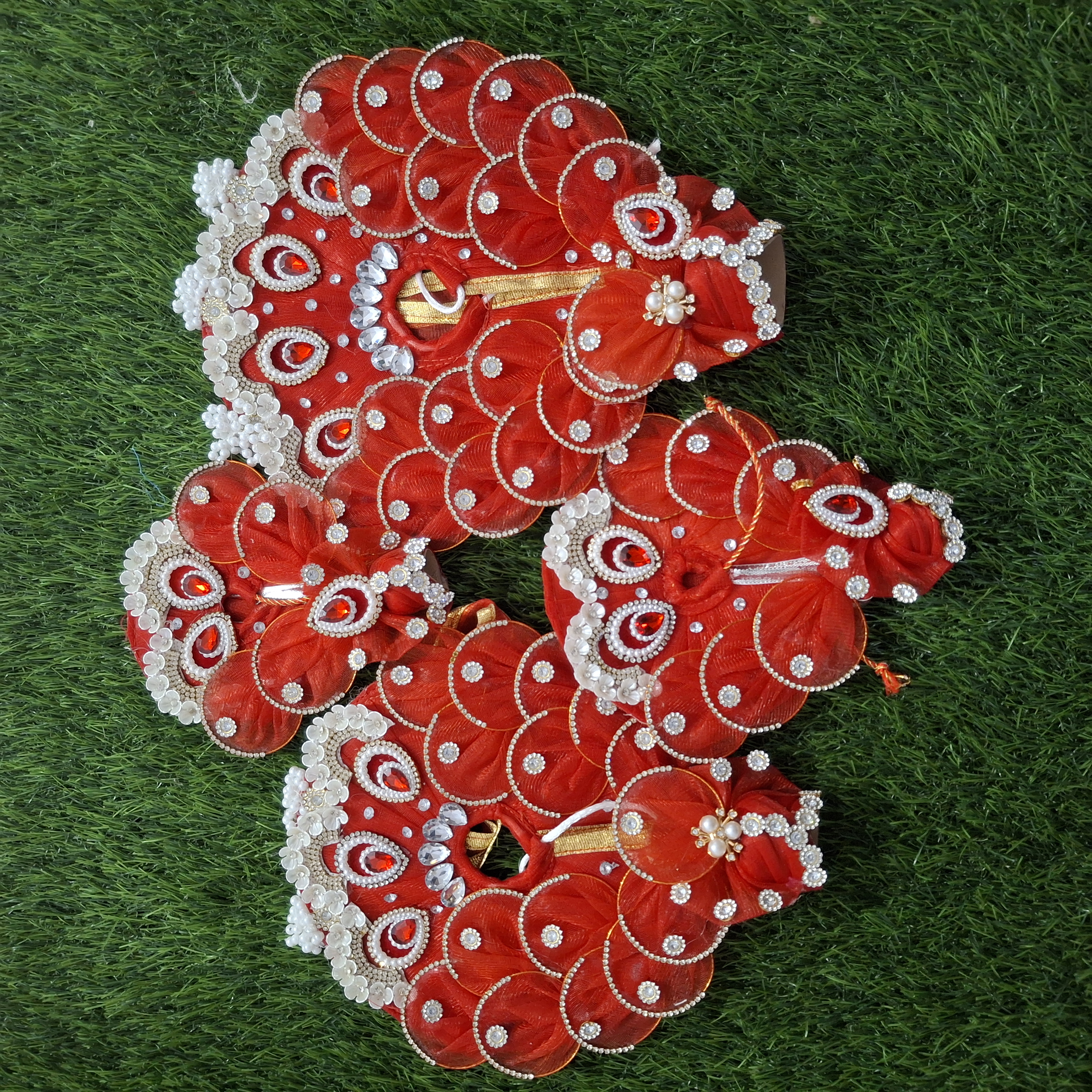 This set also includes two additional designer poshaks in vibrant red and royal blue, each decorated with sparkling stones and embroidery, offering you multiple styling options for your beloved Bal Gopal.