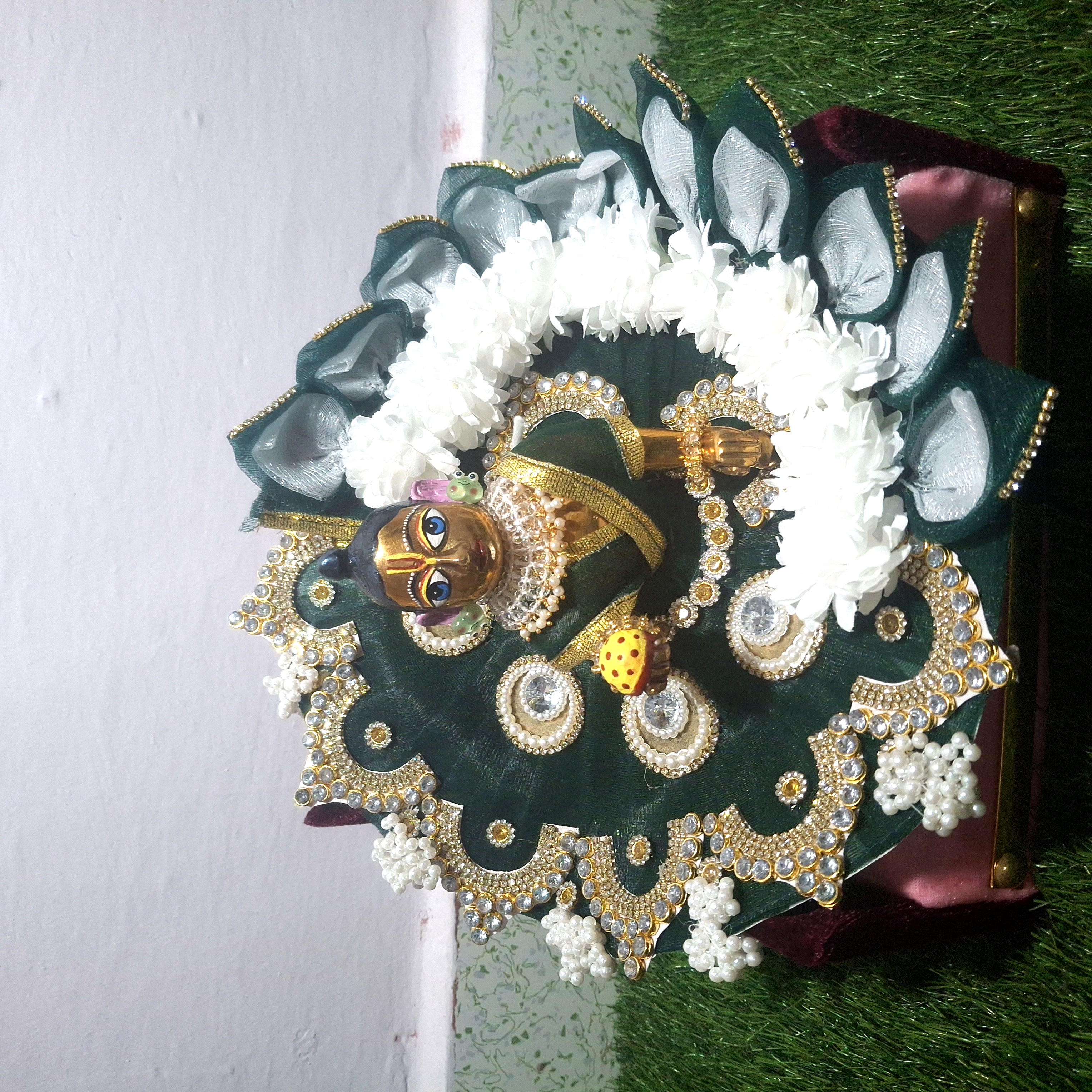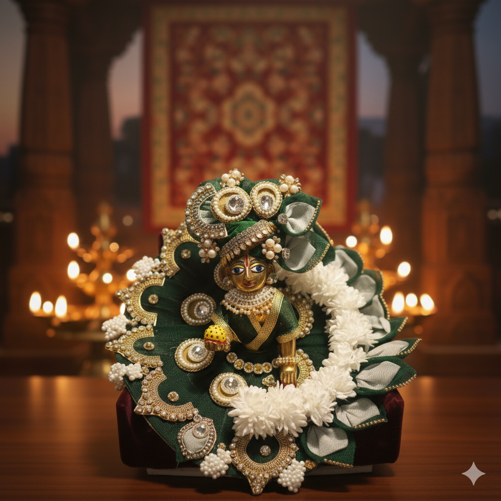 This outfit is crafted in a royal fan-style circular arrangement, where deep green velvet and white floral layers together give Laddu Gopal a divine and graceful appearance.