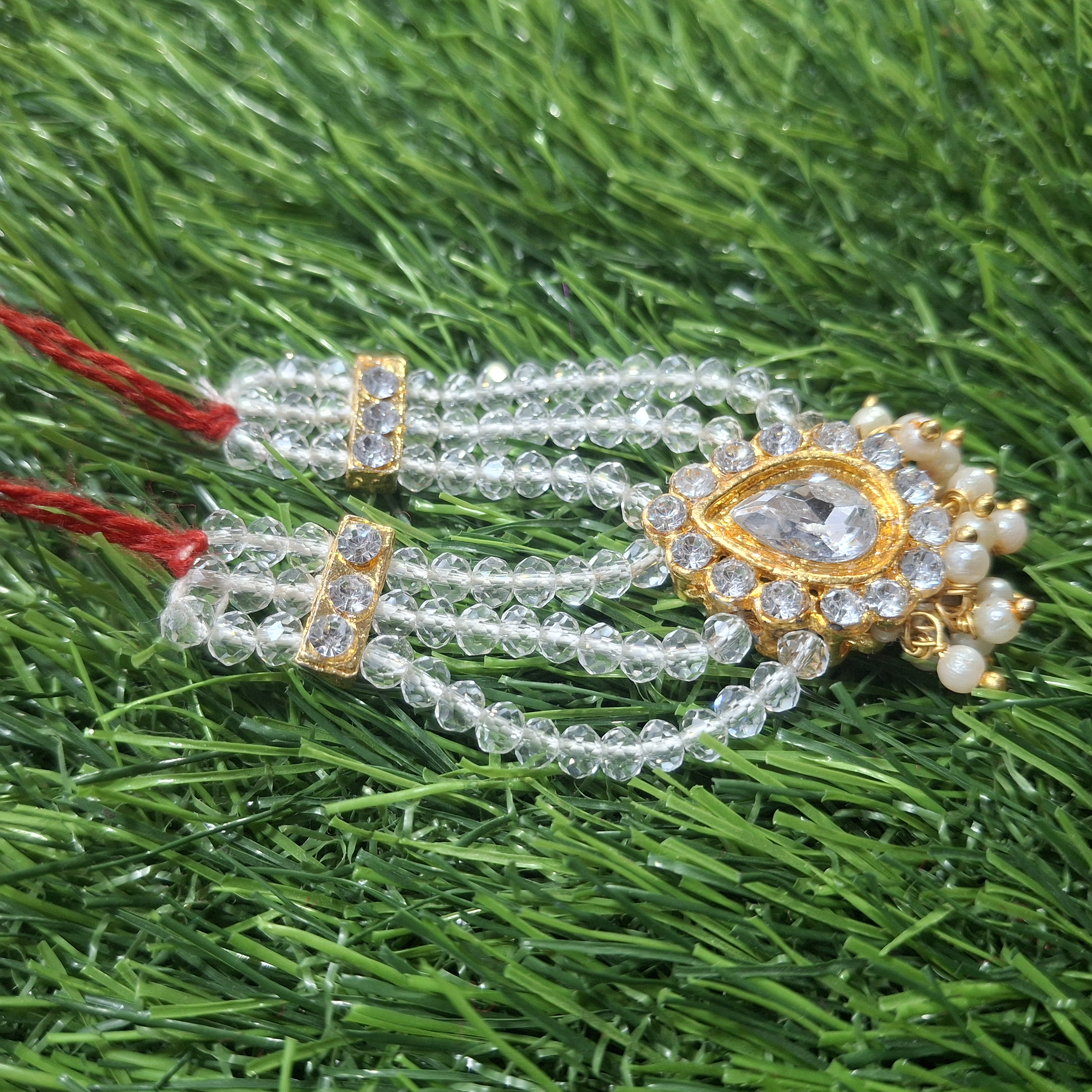 Expertly handwoven using premium-grade crystal beads, ensuring perfect symmetry and balance. The sacred red thread represents the deep spiritual connection between the devotee and Thakorji.