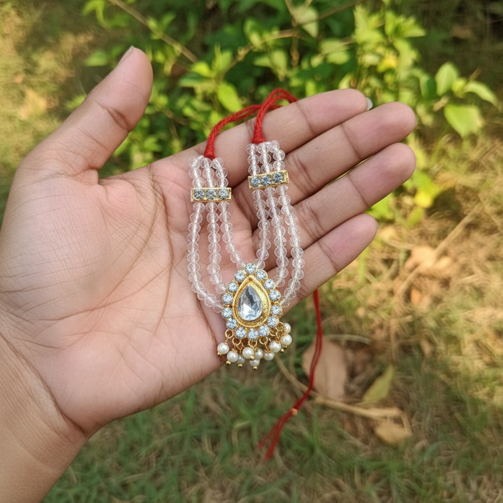 A traditional triple-layer crystal mala handcrafted exclusively for Laddu Gopal. The elegant drop-shaped pendant at the center adds a royal, temple-inspired charm — perfect for divine adornment during pooja or festive occasions.