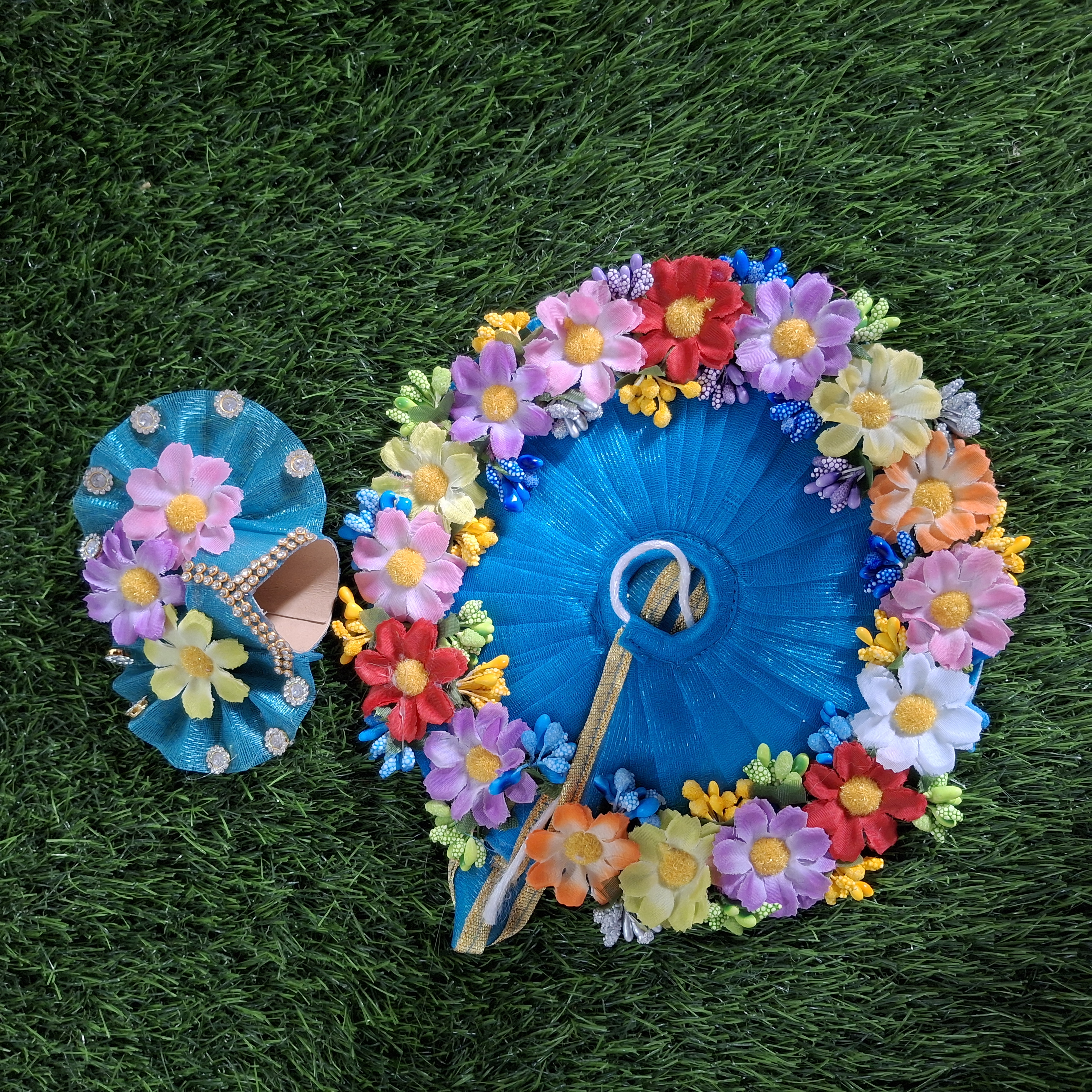 Adorn your beloved Laddu Gopal with this Enchanting Floral Turquoise Vastra Set, featuring a circular, pleated base richly decorated with a vibrant garland of multi-colored artificial flowers.