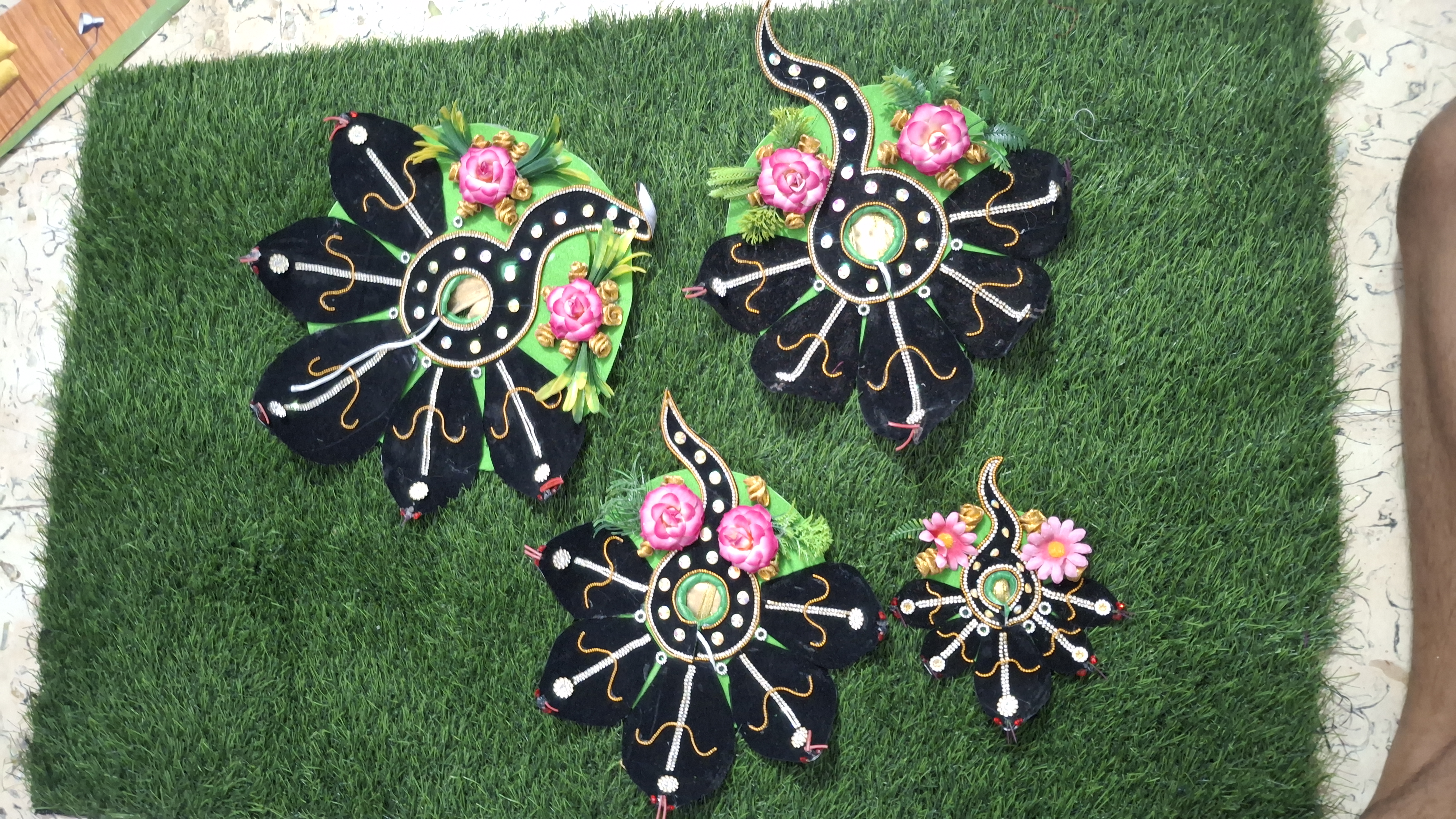 Grace your Laddu Gopal with this stunning Black Peacock Style Vastra Set, featuring a majestic feather-inspired backdrop, detailed with golden embroidery and shimmering stone work. The rich black velvet vastra with mirror embellishments adds a royal touch, while the floral decorations complete the look with divine elegance.