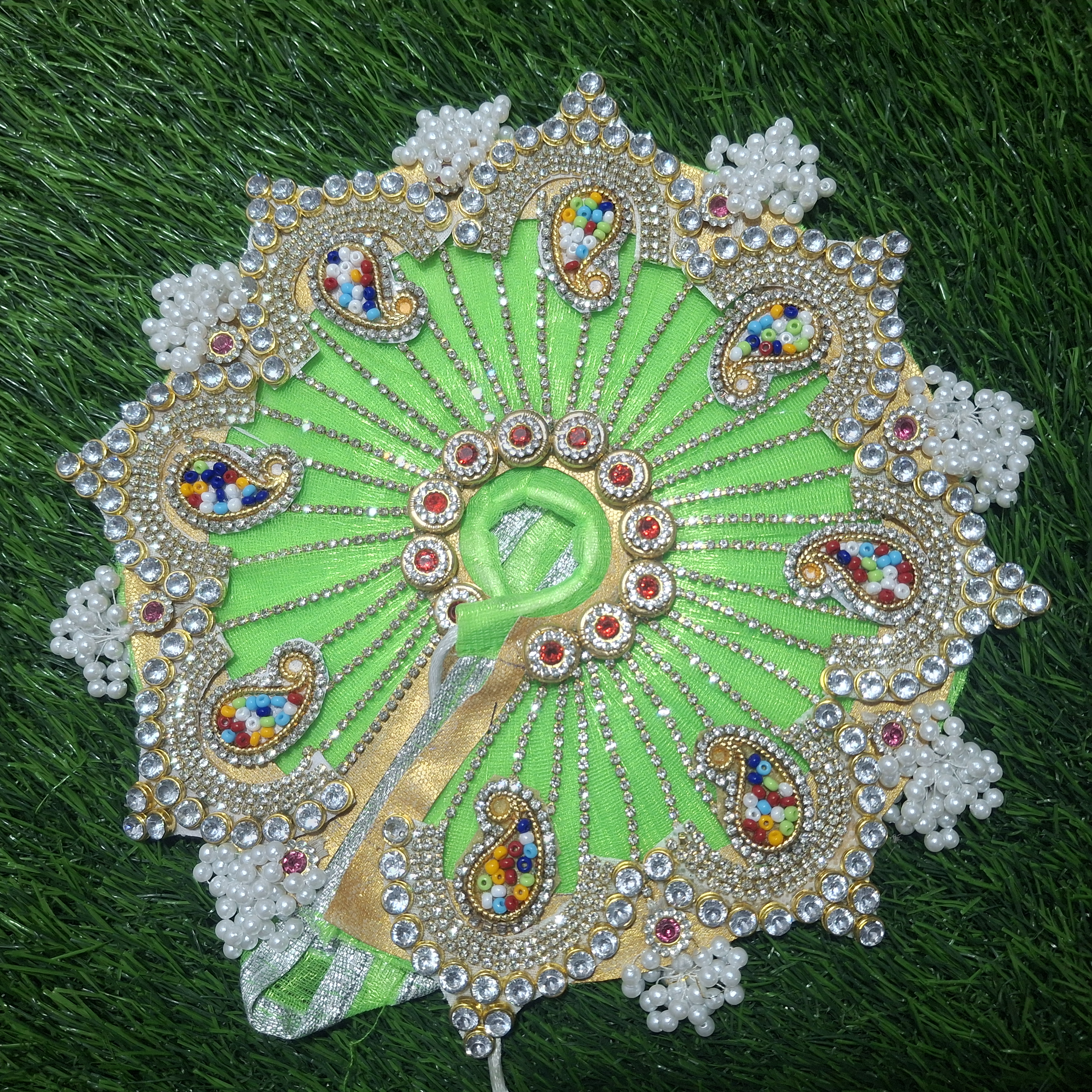 Bring home divine elegance with this Navy Blue Designer Vastra Set for your beloved Laddu Gopal. Decorated with radiant kundan stones, colorful bead paisley motifs, and delicate pearl lacework, this outfit radiates grace and grandeur. The rich velvet fabric enhances the spiritual aura, making it perfect for pooja and festive occasions.